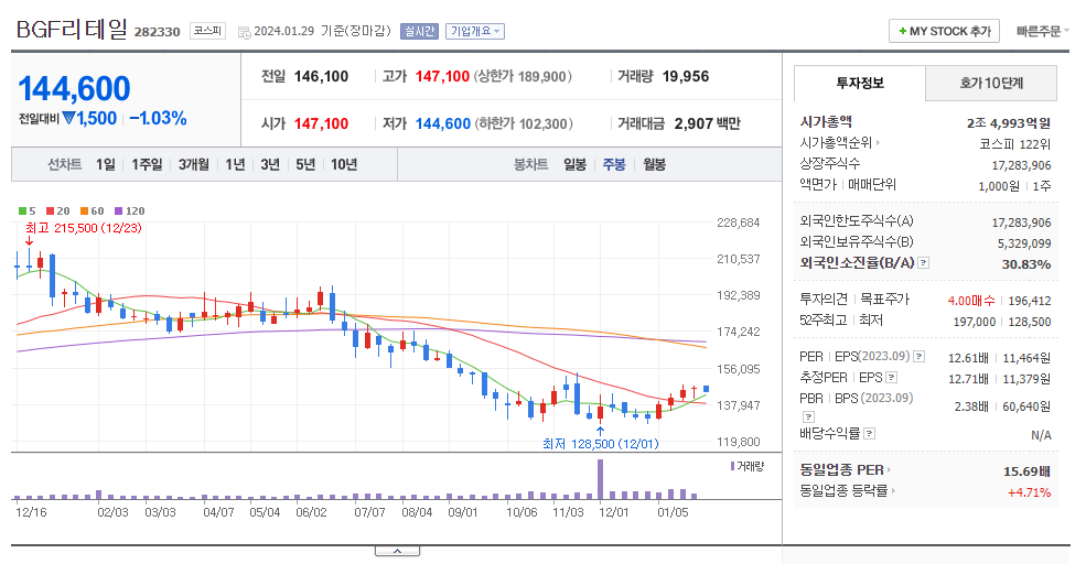 BGF๋ฆฌํ ์ผ (282330)