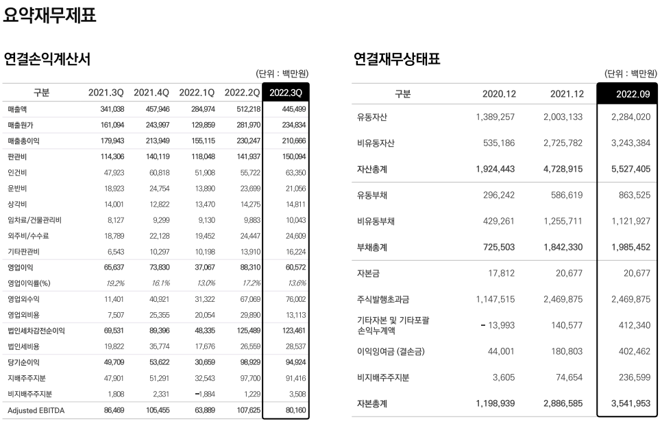 ํ์ฌ ํ์ด๋ธ๋ผ๋ ํ์ฌ์ ๋ฏธ๋ ๊ฐ์น๋ ํฌํธํด๋ฆฌ์ค ๋ค๊ฐํ ์ฑ๊ณต์ ๊ฑธ๋ ค์์ต๋๋ค. ์์์ง๋ค๋ ์ด๋ฅผ ์๊ณ ์ฌํ์ ๋คํด์ ์๋ก์ด ๊ทธ๋ฃน์ ๋ฐ๋ท์ํค๊ณ ์์ต๋๋ค. ๋ฅด์ธ๋ผํ์ 2022๋ 5์ ๋ฐ๋ท, ๋ด์ง์ค๋ 2022๋ 7์์ ๋ฐ๋ท๋ฅผ ํ๊ธฐ ๋๋ฌธ์ ์๋ฐ๊ธฐ ๋ณด๋ค๋ ํ๋ฐ๊ธฐ ๋งค์ถ์ ์ฃผ๋ชฉ์ ํด์ผ ํ ๊ฒ ๊ฐ์ต๋๋ค. ์๋ ์์ฝ์ฌ๋ฌด์ ํ๋ฅผ ๋ณด๋ฉด ์์ ์ ์ธ ๋งค์ถ ์ด์ด์ต์ ๋ณด์ฌ์ฃผ๊ณ ์์ต๋๋ค. BTS์ ๋ถ์ฌ์๋ ๋ค๋ฅธ ๊ทธ๋ฃน์ ํ๋์ผ๋ก ๋งค์ถ์ ์ ๋ฉ๊พธ๊ณ ์๋ ๊ฒ์ ํ์ธํ ์ ์๊ณ , ์์ ์ด์ต๋ฅ ๋ํ 10~13%๋๋ก ๊พธ์คํ ์ด์ต์ ๋ด๋ ๊ฒ์ ํ์ธํ ์ ์์ต๋๋ค.