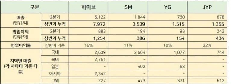 BTS์ ๊ทธ๋ฃนํ๋ ์ค๋จ์ด ์์์์๋ ํ ์ํฐ์ ๊ณ ๋๋น ๊ฐ์ฅ ํฐ ๋งค์ถ์ ๋ณด์ด๊ณ ์์ต๋๋ค. ์์ ์ด์ต๋ฅ ์ ๋น๋ก JYP๋๋น ์ ์ง๋ง, ๊ธ์ก ์์ฒด๋ ๋ ๋ณด์ ์ธ 1์๋ฅผ ๋ณด์ฌ์ฃผ๊ณ ์์ต๋๋ค.