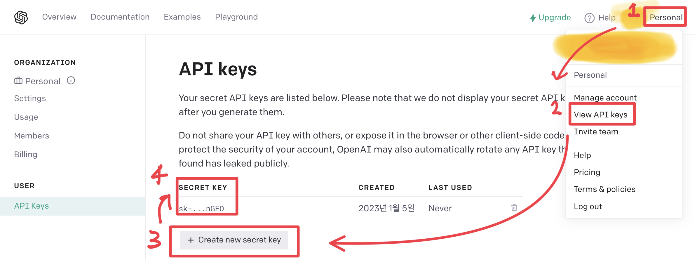 1. OpenAI์ ๊ฐ์ ํ๊ณ ๋ก๊ทธ์ธ์ ํ๋ค > API ํ์ด์ง๋ก ์ด๋ํ์ฌ ์ค๋ฅธ์ชฝ ์๋จ์ ํ๋กํ์ผ์ ํด๋ฆญ