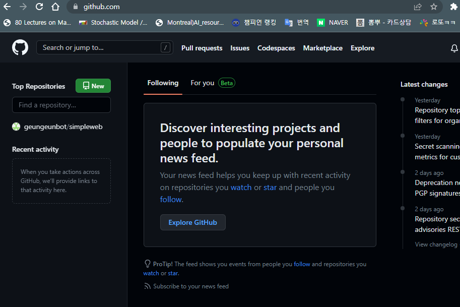 ChatGPT๋ก HTML๊ณผ CSS๋ฅผ ์์ฑํ๋ค๋ฉด, Github์ผ๋ก ๋ฐฐํฌ๋ฅผ ํด์ ๋ค๋ฅธ์ฌ๋๋ค์ด ๋ณผ ์ ์๊ฒ ์นํ์ด์ง๋ฅผ ์์ฑํ ์ ์์ต๋๋ค. https://github.com ํ์ด์ง ์ ์ํ ๋ค, ์๋ก์ด Repository๋ฅผ ๋ง๋ญ๋๋ค.