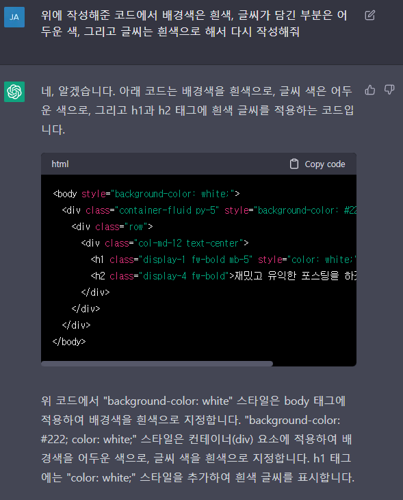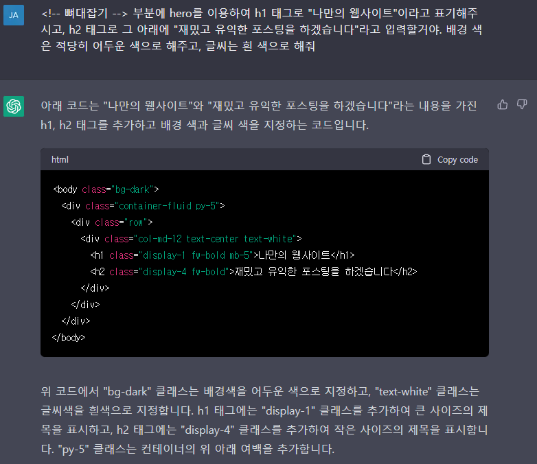 ์ฑGPT๊ฐ ์์ฑํด์ค ์ฝ๋๋ฅผ ๋งจ ์์ html ์ฝ๋์ ๋ผ๋์ก๊ธฐ ๋ถ๋ถ์ ๋ณต๋ถํด์ VSCode์ ์ ๋ ฅ์ ํ๋ฉด ๋ฉ๋๋ค.