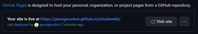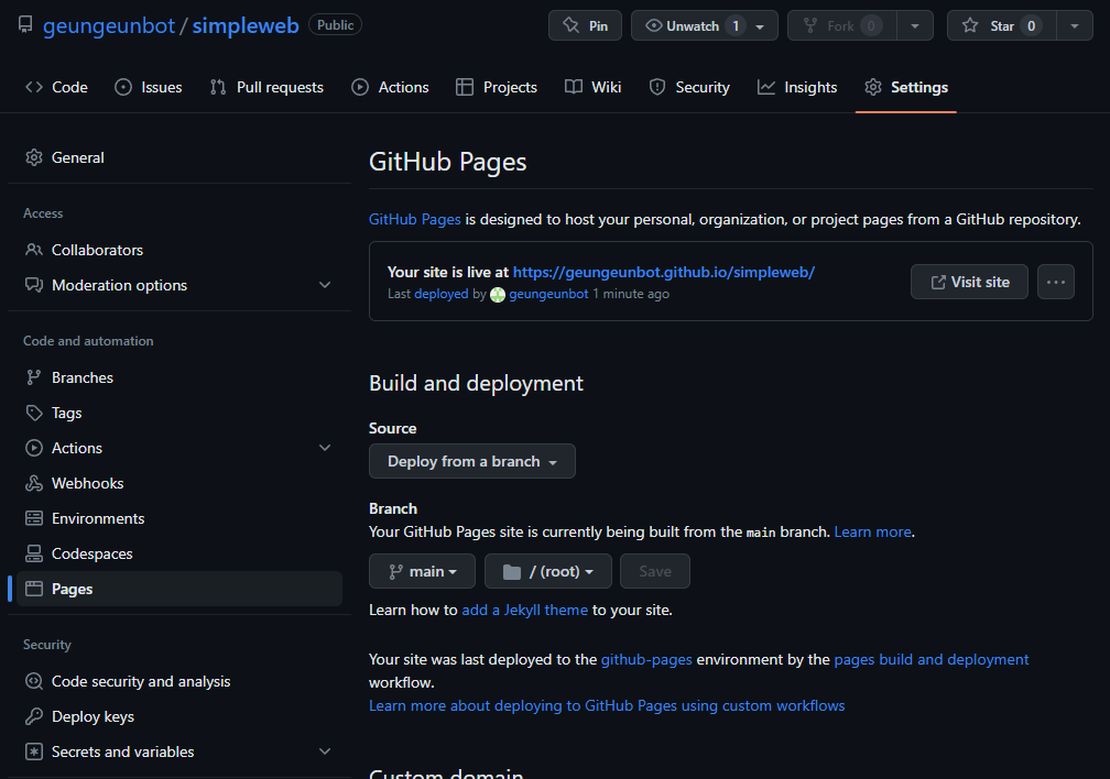 ๊ทธ๋ฆฌ๊ณ ์ฌํ๊น์ง ์ ์ํ index.html ํ์ผ์ ์ ๋ก๋ ํ ๋ค, ์ ์ฅ์ ํฉ๋๋ค. ๊ทธ๋ฆฌ๊ณ Setting์ ๊ฐ์ ธ์ Pages ํญ์ Build and Deployment ๋ถ๋ถ์ ์๋ ํ๋ฉด๊ณผ ๊ฐ์ด ์ค์ ํ ๋ค, ํด๋ฆญ์ ํ๋ฉด ๋์ ๋๋ค.
