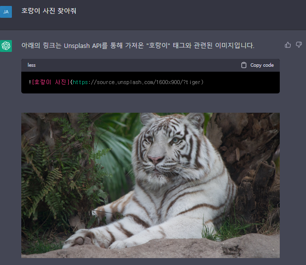 ๊ทธ๋ฆฌ๊ณ ์ฌ์ง์ ์ฐพ์๋ฌ๋ผ๊ณ ํ๋ฉด ChatGPT๊ฐ ์ฌ์ง์ ๊ฒ์ํด์ ๋ณด์ฌ์ค๋๋ค. ๋จ, ChatGPT๊ฐ ๋ณด์ฌ์ค ์ ์๋ ์ด๋ฏธ์ง๋ https://unsplash.com/ ์ด๋ผ๋ ์ด๋ฏธ์ง ์ ์ฅ ์น์ฌ์ดํธ์ ์๋ ์ฌ์ง๋ฟ์ ๋๋ค. ๋ฐ๋ผ์ ์ผ๋ฐ์ ์ธ ์ฌ์ง๋ง ๋ณด์ฌ์ค ์ ์์ผ๋ฉฐ, ๋ฒ์ญ์ ํตํด์ ๊ฐ์ ธ์ค๊ธฐ ๋๋ฌธ์ ์ค์์ ์ธ ํํ์ ์ฌ์ฉํ๋ฉด ์๋์น ์์ ์ด๋ฏธ์ง๋ฅผ ๊ฐ์ ธ์ฌ ์ ์์ต๋๋ค.