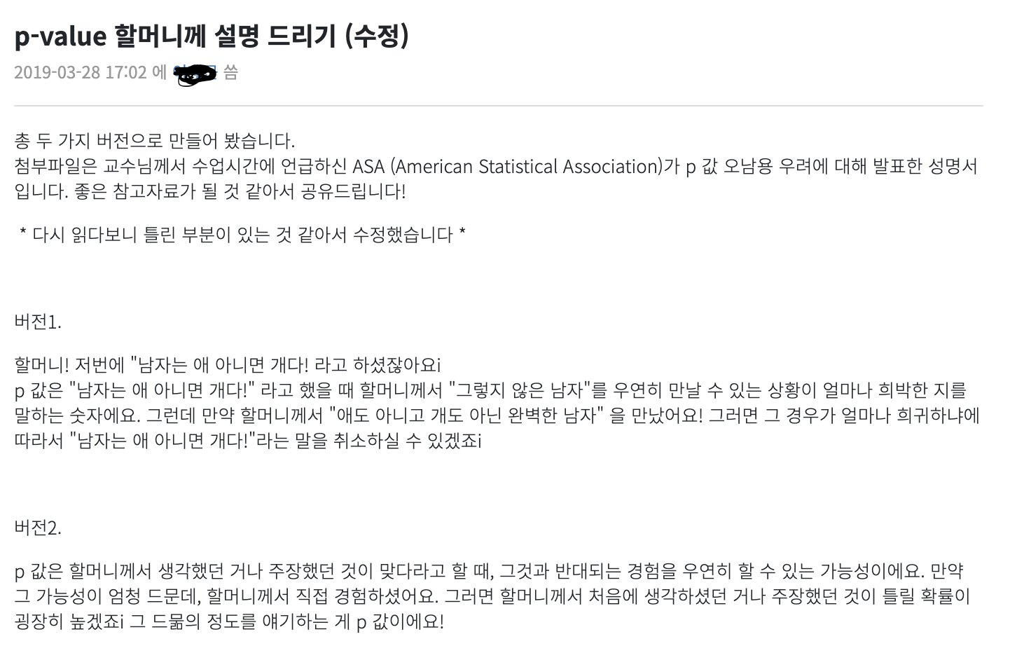์ฅํฉํ๊ฒ ์ค๋ช ์ ํ๊ณ ๋ ๋ค ์ง์ ๋์์์๋ ๋ฟ๋ฏํจ๋ณด๋ค๋ ์์ฌ์์ด ๋จ์๋ค. ์ด์ ์ ๋ํด์ ๊ณฐ๊ณฐ์ด ์๊ฐ์ ํด๋ณด๋ ๋ด ์ค๋ช ์๋ p-๊ฐ์ ํจ์ ์ ๋ํ ์ค๋ช ์ด ๋น ์ ธ์์๋ค! ๋ค์์ ๋๊ตฐ๊ฐ์๊ฒ p-๊ฐ์ ๋ํ ์ค๋ช ์ ํ ๋๋ ์๋ ๋ด์ฉ์ ํฌํจํ์ฌ ์ข ๋ ์๋ฒฝํ๊ฒ ์๊ธฐ๋ฅผ ํ ์ ์๋๋ก ๋ค์ ๋ค์ง์ ํด๋ดค๋ค. (๋ด๊ฐ ๋ด๋ ๋๋ nerdy ํ ๋ถ๋ถ์ด ์ข ์๋ ๊ฒ ๊ฐ๋ค ใ ใ